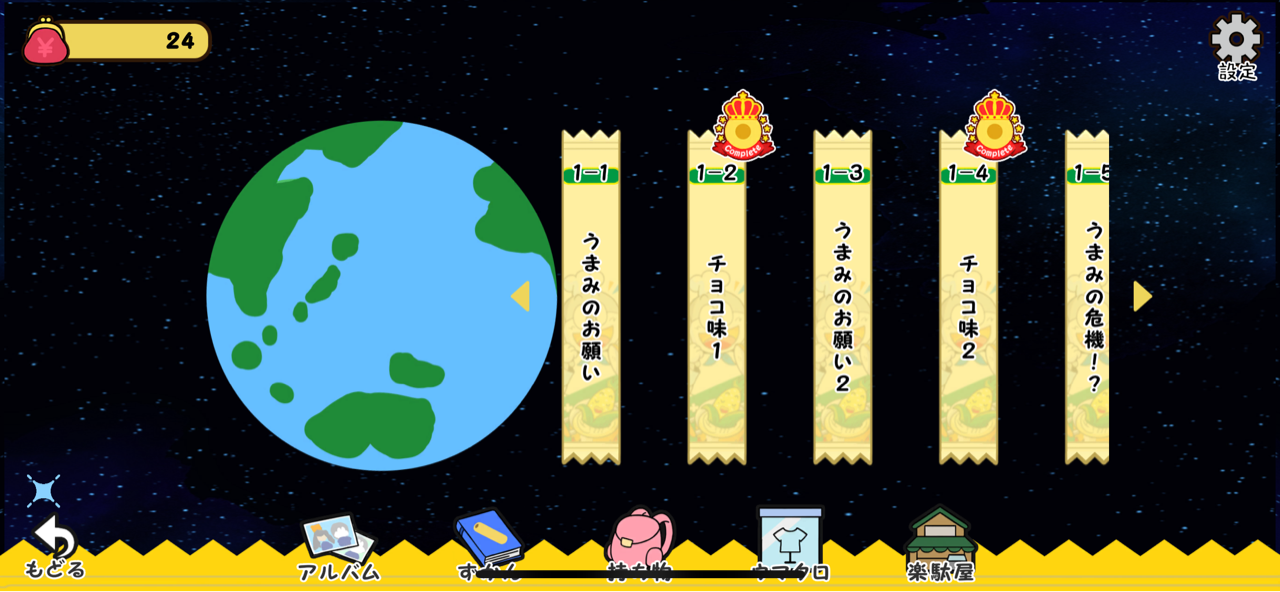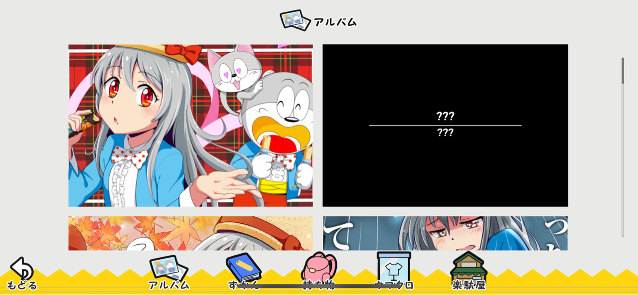 ↑アルバムに条件不明のスチルがあり、このパーフェクトクリアが関わってくる可能性も大いにある。(どうやらアプリを閉じるとパーフェクトクリアのメダルは消えて、回収したうまい棒も復活してしまうようなのでこれはないかもしれない)→(パーフェクトメダルが消えてしまうのはバグであり調査中とのことです、今後修正されるでしょう)修正されました